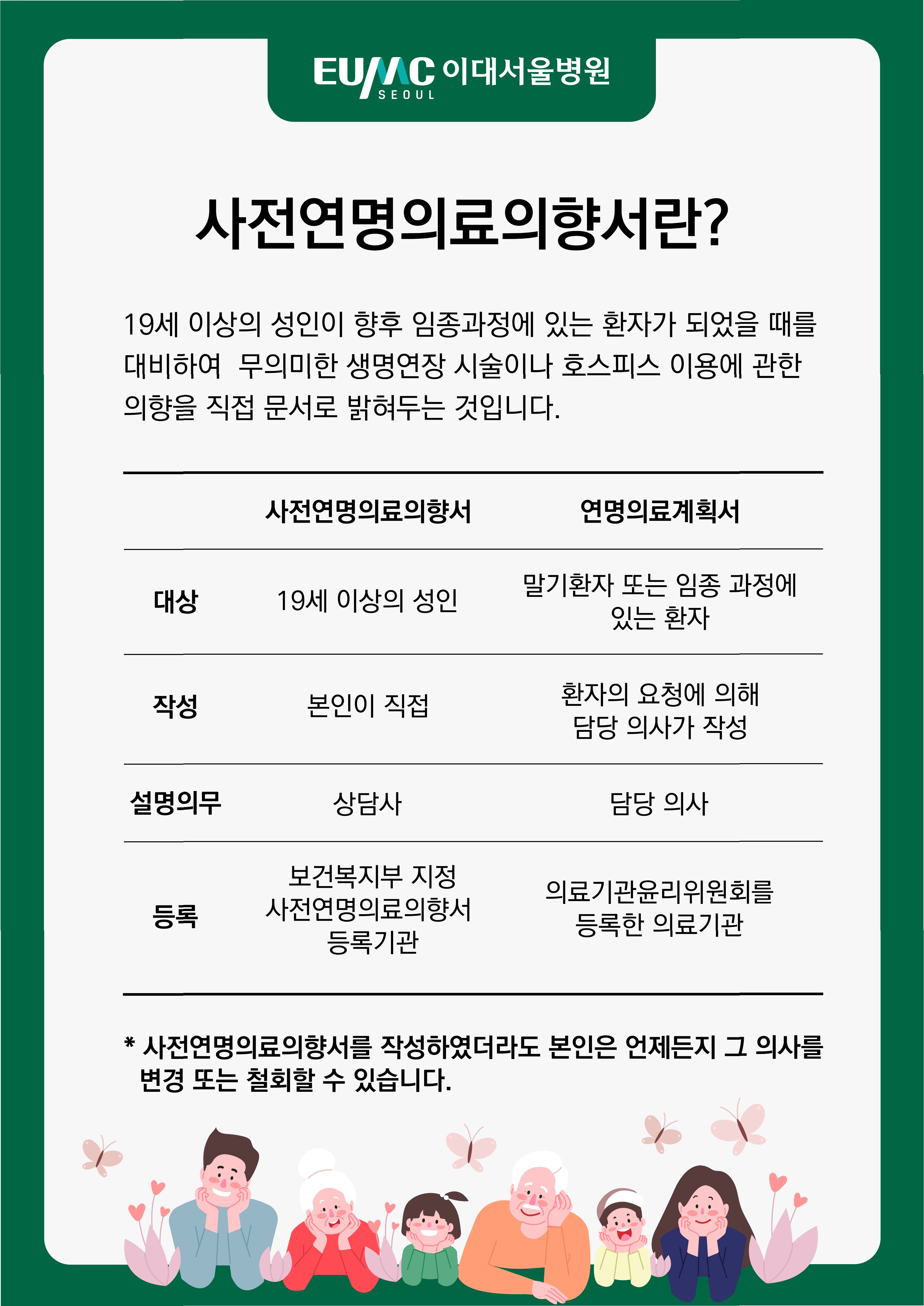 A.사전연명의료의향서는 언제든지 변경하거나 철회할 수 있습니다. 등록했던 기관을 방문하여 변경 또는 철회 의사를 밝히고, 관련 절차를 따르면 됩니다.