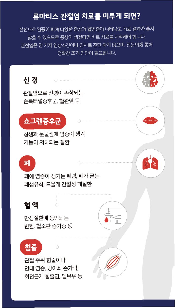 류마티스 질환은 다양한 형태로 나타나며, 개인의 삶에 큰 영향을 미칠 수 있습니다. 조기 진단과 적절한 치료, 그리고 환자 스스로의 적극적인 관리 노력을 통해 류마티스 질환과 함께 건강하고 행복한 삶을 살아갈 수 있습니다. 류마티스 질환은 더 이상 혼자 겪는 고통이 아닙니다. 의료진, 가족, 그리고 주변 사람들의 지지와 도움을 통해 긍정적인 변화를 만들어갈 수 있습니다. 류마티스 질환에 대한 정확한 정보와 올바른 치료법을 통해 건강한 삶을 유지하고, 삶의 질을 향상시키세요.