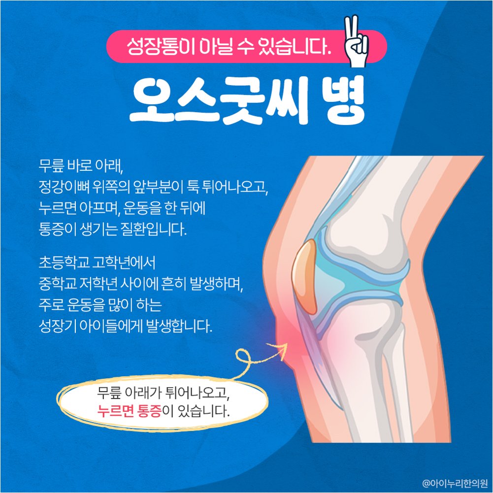 성장통은 주로 3~12세 아이들에게 나타나는 비교적 흔한 증상입니다. 다리의 넓적다리, 종아리, 무릎 등에서 주로 통증을 느끼며, 주로 저녁이나 밤에 통증이 심해지는 경향이 있습니다. 성장통은 관절보다는 근육 부위에 통증이 나타나며, 활동량이 많은 날이나 피로가 쌓였을 때 더 심하게 나타나는 경우가 많습니다. 특별한 치료 없이도 시간이 지나면 자연스럽게 호전되는 경우가 대부분이며, 통증 완화를 위해 마사지, 온찜질, 스트레칭 등을 해줄 수 있습니다. 하지만, 성장통은 아직 정확한 원인이 밝혀지지 않았으며, 성장과는 직접적인 관련이 없다는 연구 결과도 있습니다. 따라서, 아이의 통증이 심하거나, 다른 증상이 동반된다면 반드시 전문의의 진료를 받아 정확한 진단을 받는 것이 중요합니다.