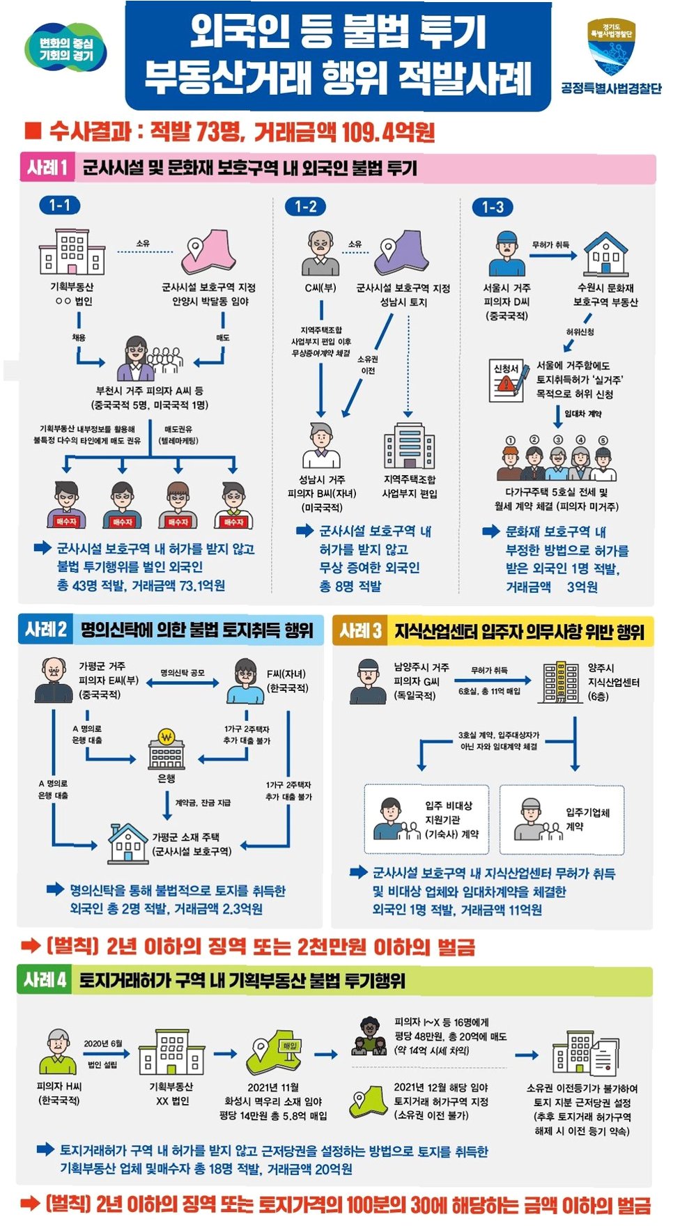 국토부는 2022년부터 외국인 부동산 취득 이상 거래를 선별해 기획 조사를 하고 있습니다. 2022년 국토부 주택투기 기획조사에서는 적발된 위법 의심 행위 567건 중 중국인이 314건, 2023년 토지 기획조사에서는 528건 중 중국인이 211건으로 나타났습니다. 지난해 주택투기 및 토지·오피스텔 조사에서도 위법 의심 행위 433건이 확인된 가운데 중국인이 192건으로 가장 많이 적발되었습니다. 이는 외국인 부동산 투기 관련 문제에서 중국인의 연루가 상당함을 보여줍니다.