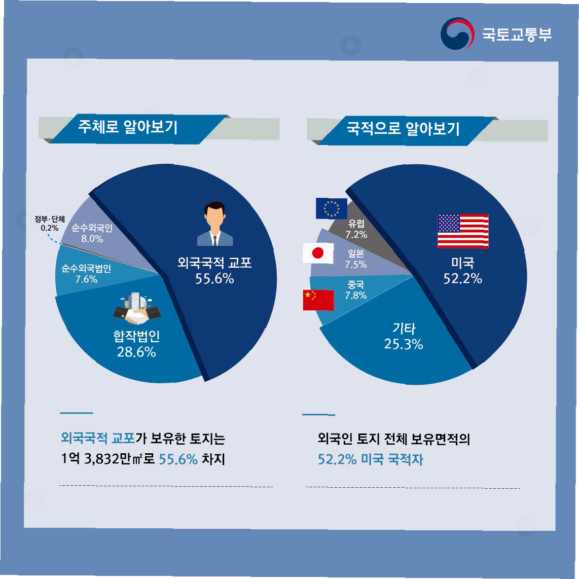 면적의 경우 미국인이 총 1억4331만㎡(53.4%)를 보유해 가장 컸습니다. 미국인이 보유한 토지는 6만2733필지입니다. 중국과는 다른 양상으로, 미국의 경우 면적 단위의 대규모 투자가 두드러지는 경향을 보입니다.
