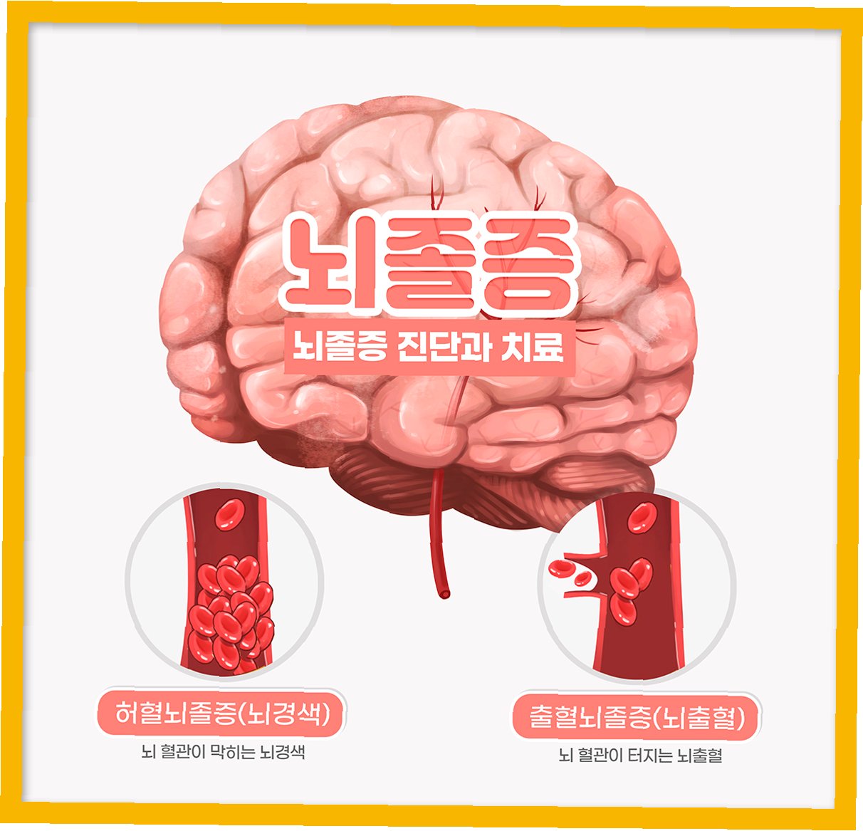 뇌졸중은 뇌의 특정 부위에 혈액 공급이 제대로 이루어지지 않아 뇌세포가 손상되는 질환입니다. 뇌졸중의 원인은 크게 두 가지로, 뇌혈관이 막히는 '뇌경색'과 뇌혈관이 터지는 '뇌출혈'이 있습니다. 뇌경색은 혈전(피떡)이 뇌혈관을 막아 발생하며, 뇌출혈은 뇌혈관의 파열로 인해 뇌 조직 내에 출혈이 생기는 경우입니다. 뇌졸중은 발생 부위와 손상 정도에 따라 다양한 증상을 보입니다. 갑작스러운 두통, 어지럼증, 시야 장애, 언어 장애, 마비 증상 등이 나타날 수 있으며, 이러한 증상들은 뇌졸중의 초기 신호일 수 있습니다. 뇌졸중은 신속한 대처가 생명을 좌우하는 질환이므로, 의심 증상이 나타나면 즉시 병원을 찾아 정확한 진단과 치료를 받아야 합니다. 뇌졸중은 한 번 발생하면 회복이 쉽지 않으므로, 예방이 무엇보다 중요합니다.