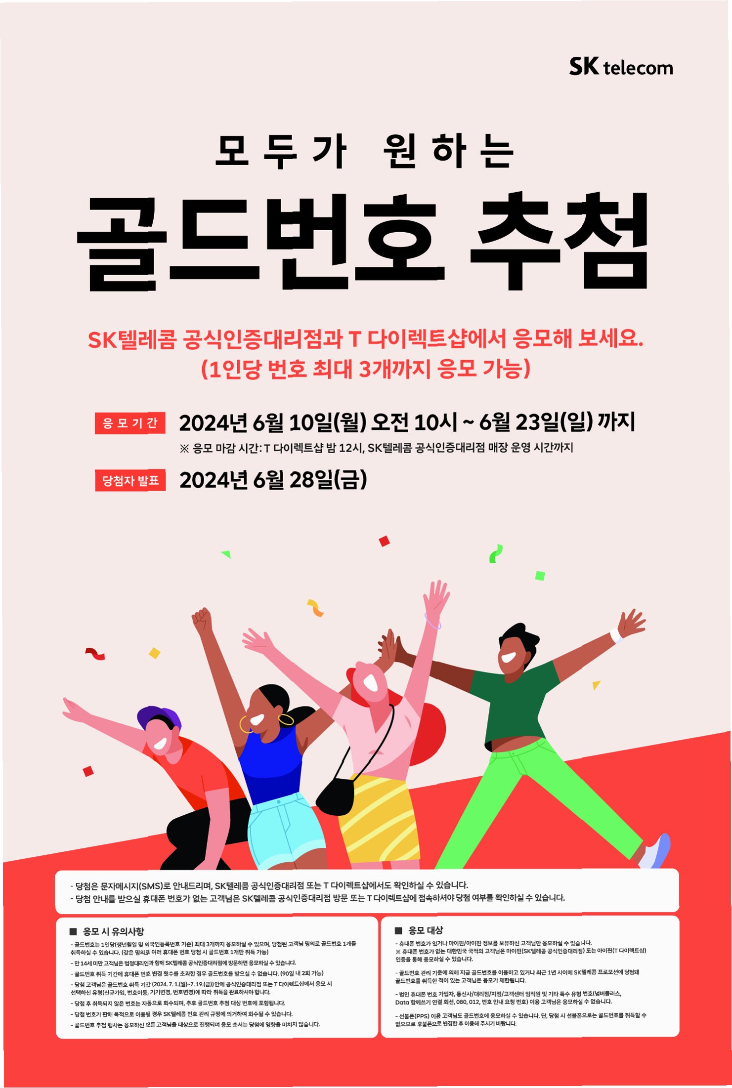 SK텔레콤은 2023년부터 추첨 방식으로 골드번호 배정을 확대하여, 더 많은 고객에게 특별한 기회를 제공하고 있습니다. 이번 프로모션을 통해, 오랫동안 꿈꿔왔던 골드번호를 가질 수 있는 행운을 잡으세요! 지금 바로 신청하고, 27일 발표를 기다리며 설레는 마음으로 결과를 확인해 보세요. 당신의 번호에 행운이 깃들기를 바랍니다!